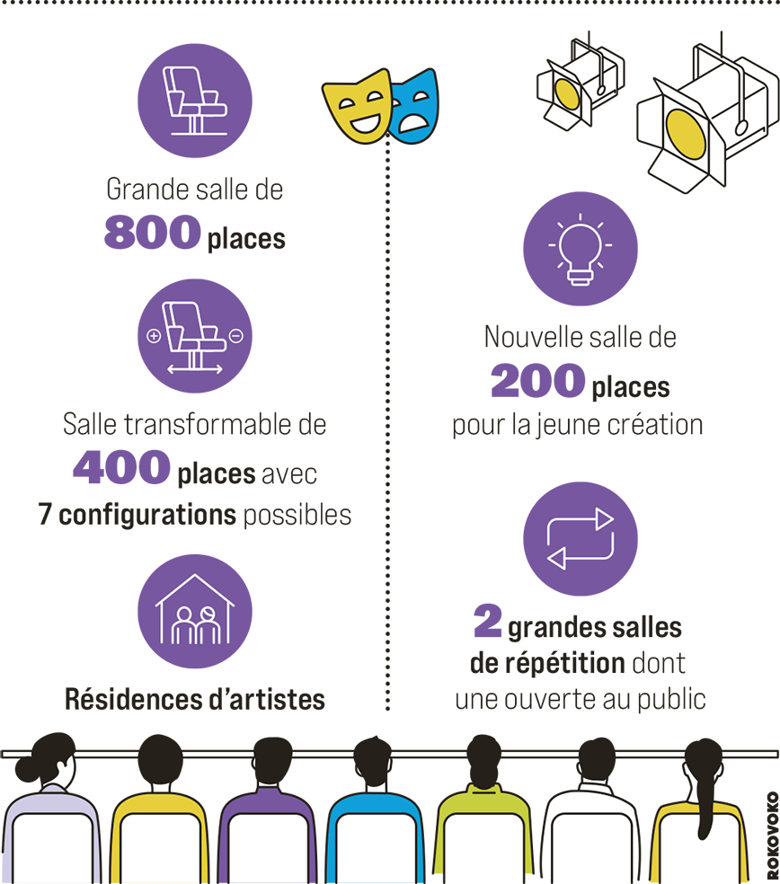Absolument requise, la mise aux normes du théâtre quinquagénaire a eu lieu comme promis. Des extérieurs aux salles, les lieux ont été rendus accessibles aux personnes à mobilité réduite ; tandis que la réfection de l’isolation, du chauffage et de la ventilation limite l’impact de l’agrandissement du bâtiment qui reste toutefois « compact ». « Nous sommes intervenus sur des secteurs très ciblés, le hall et l’extension (qui abrite, outre la petite salle, l’un des deux studios de répétition, des bureaux et des résidences d’artistes, NDLR) pour ne pas multiplier les linéaires de façade », dit Guillaume Barbaroux.