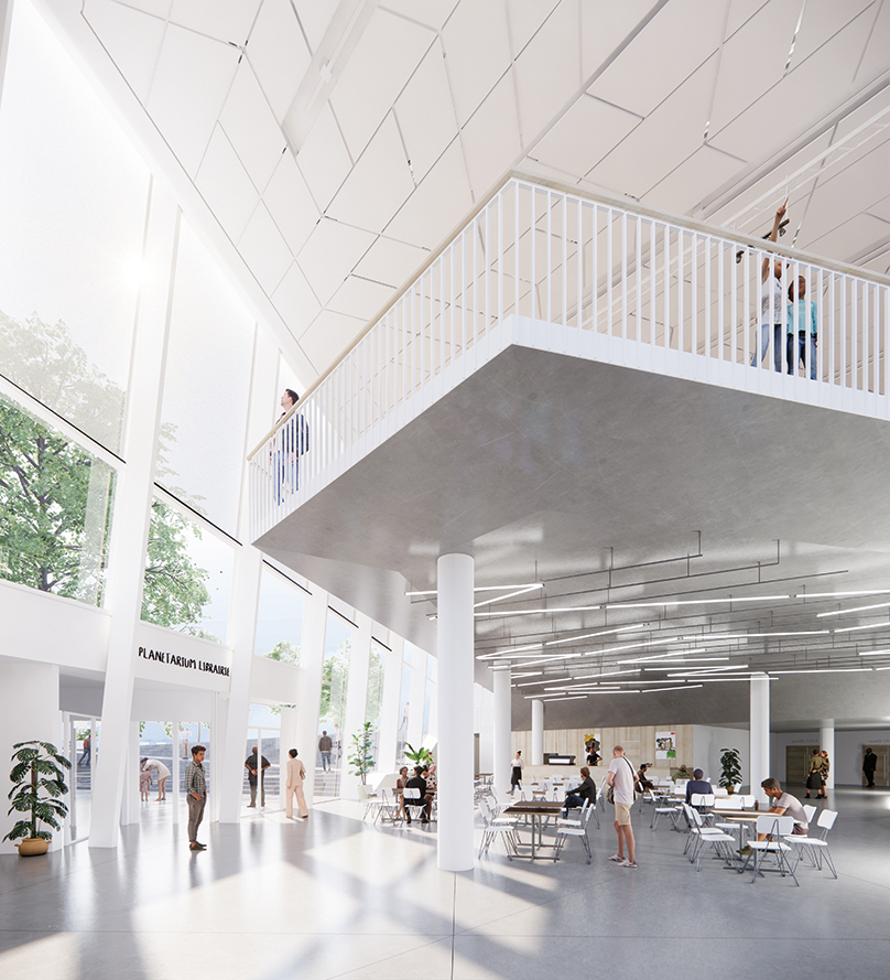 On aborde le nouveau théâtre des Amandiers par deux parvis haut et bas et par un hall d’entrée refait de fond en comble. Avec ses lignes tendues et ses baies de douze mètres de haut donnant sur le parc et l’avenue Pablo-Picasso, il s’agit là du geste architectural majeur de Snøhetta à Nanterre. « L’ancien bâtiment avait une partie enterrée qui a été rouverte, on augmente ainsi la surface d’accueil et on double les accès aux salles. La grande transparence de ce hall donnant sur l’intérieur du bâtiment est aussi une invitation à entrer », précise l’architecte. « L’accès à la culture pour tous, c’est ce en quoi Snøhetta croit énormément ; ce hall sera en quelque sorte la quatrième salle du théâtre, renchérit Oliver Page, directeur général de Snøhetta Paris. Son apparence variera selon les saisons et les heures, c’est un élément urbain en connexion avec tout ce qui l’entoure. » Dans la partie basse du parvis, la librairie, transférée sous le dôme de l’ancien planétarium, ainsi que le restaurant des Amandiers, feront vivre l’espace public. Le théâtre sera, à terme, desservi par un arrêt du tramway T1 prolongé vers Nanterre et Rueil-Malmaison.