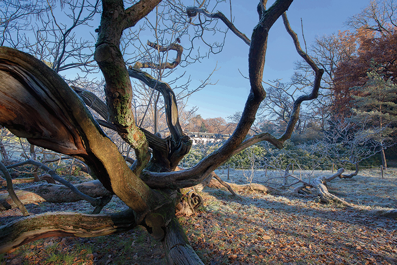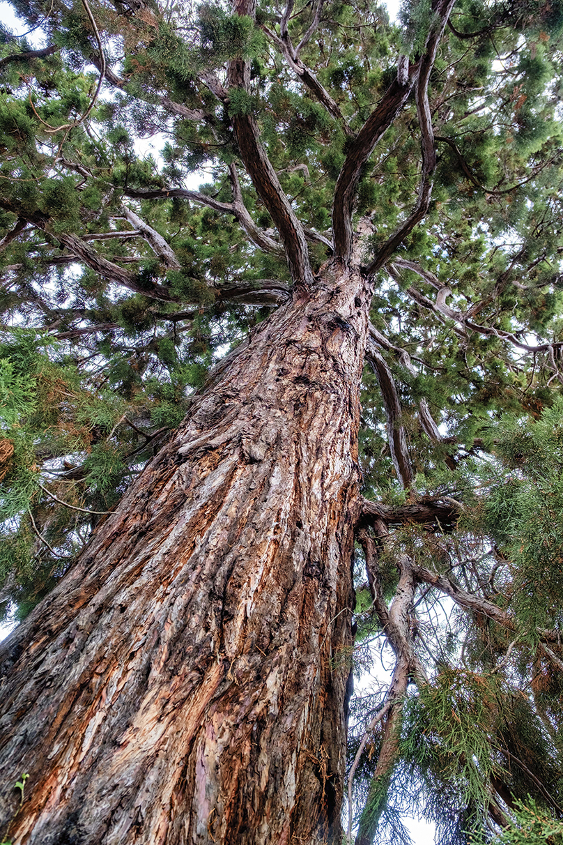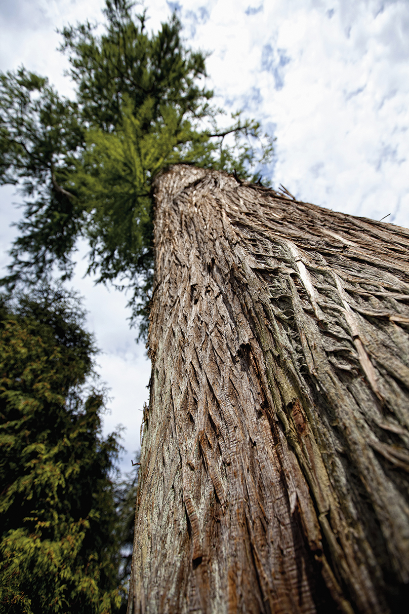 Si le point a été fait sur son écorce rougeâtre et crevassée, ce cyprès chauve est remarquable pour son port étalé qui se dessine dans le flou de l’image. Son nom tient à la différence qu’il cultive vis-à-vis d’une majeure partie de ses frères les conifères. Comme le mélèze, lui appartient aux caducs, autrement dit son feuillage n’est pas persistant. Après avoir revêtu une teinte rousse, son sommet se dégarnit pour rester « chauve » tout l’hiver. Il est l’emblème des marécages du sud-est des États-Unis, où prime son atout : ses pneumatophores, des excroissances boisées par lesquelles il capte l’oxygène. D’une espérance de vie théorique de 2 000 ans, ce sujet d’à peine plus d’un siècle a le temps pour lui.