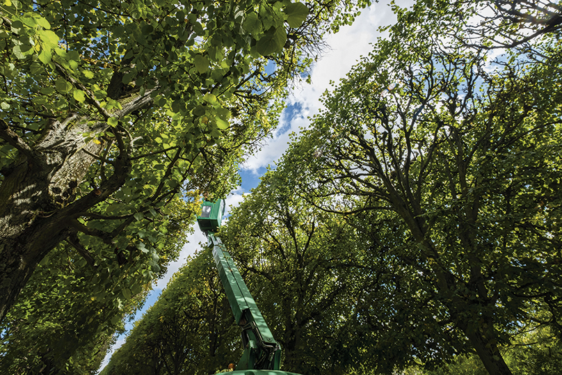 À côté des arbres isolés, synonymes de puissance et de majesté, on distingue au sein de la « société des arbres » des groupes ou des alignements au moins aussi remarquables. De quelque trois cent cinquante sujets, l’Allée d’honneur de Sceaux est de ceux-là. Ces Tilleuls communs, parmi les plus répandus des régions tempérées d’Europe avec le Tilleul à grandes feuilles et argenté, supportent très bien la taille. Le prestige de sa perspective tient à leur élagage « en marquise », qui nécessite cette nacelle à 12 mètres suspendue dans le vide.