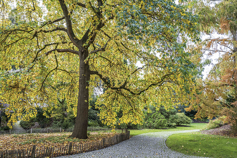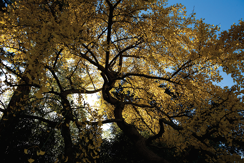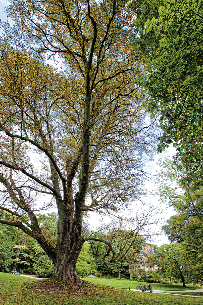 La Terre accueillait, outre ses ancêtres, ses semblables il y a, déjà, 270 millions d’années. Dernier des Ginkgoaceæ, le biloba aurait succombé à son tour – au Quaternaire, la glaciation faisait rage – s’il n’avait trouvé refuge en Chine du Sud. Là, il y demeure fort apprécié, son feuillage d’or y joue beaucoup. C’est pourtant loin de l’Asie qu’une mutation spontanée engendra ce « cultivar ». Le ginkgo ‘St-Cloud’, unique jusqu’à preuve du contraire, arbore un port distinctif pleureur et une foliation dense de petits éventails. Couru des botanistes et du public en général, ce spécimen s’admire idéalement en saison automnale.