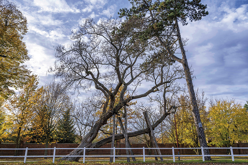 Vu sous cet angle, ce catalpa semble en proie à quelque sortilège… Le calme après la tempête qui le coucha le vit débuter cette incroyable « sculpture végétale », un méli-mélo fantastique où tronc, branches et racines s’amalgament. Et le sujet au printemps est tout ce qu’il y a de plus vigoureux ! À l’état sauvage, on le rencontre au sud-est de l’Amérique du Nord, précisément où Chateaubriand cingla vers 1791. De quoi conforter l’hypothèse qu’il fut planté en son domaine par nul autre que lui-même.