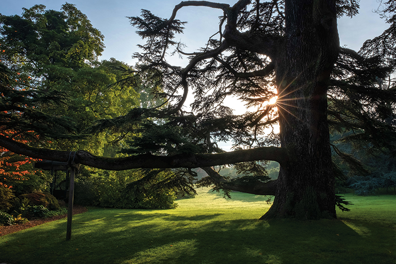 Du Liban, le Cedrus libani est l’emblème, qui s’invite en Turquie et en Syrie. Fut-il en Europe introduit par les croisés ? Ou bien plus tard, à la Renaissance ? Nul ne le sait. Le doyen de l’Arboretum fut en tout état de cause, un des tout premiers à voir sa plantation consignée de France. Son âge, déduit d’une mise en terre vers 1750, n’est qu’un battement de cil dans la vie d’un cèdre (2 000 ans). Avec les vétérans, ce « jeune plant » a toutefois en commun les blessures ; la plus terrible fut peut-être la perte de sa cime. Sa silhouette tabulaire que souligne ce rai de lumière exige pour les voir un œil exercé. Exceptionnel par sa circonférence, rien qu’elle lui valait sa place au tableau d’honneur.