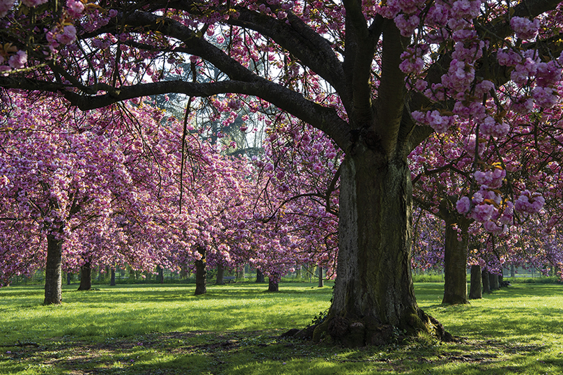 Au Japon, les fleurs du sakura, cerisier d’ornement, symbolisent le printemps et la beauté éphémère. En avril, leur éclosion donne lieu à une cérémonie séculaire, Hanami, littéralement « regarder les fleurs », qui blanches et roses couvrent les deux bosquets du Domaine départemental de Sceaux. Si le cerisier du Japon ‘Kanzan’ est un cultivar assez répandu, une telle réunion de quelque cent-cinquante sujets en fait un groupe particulièrement distingué.