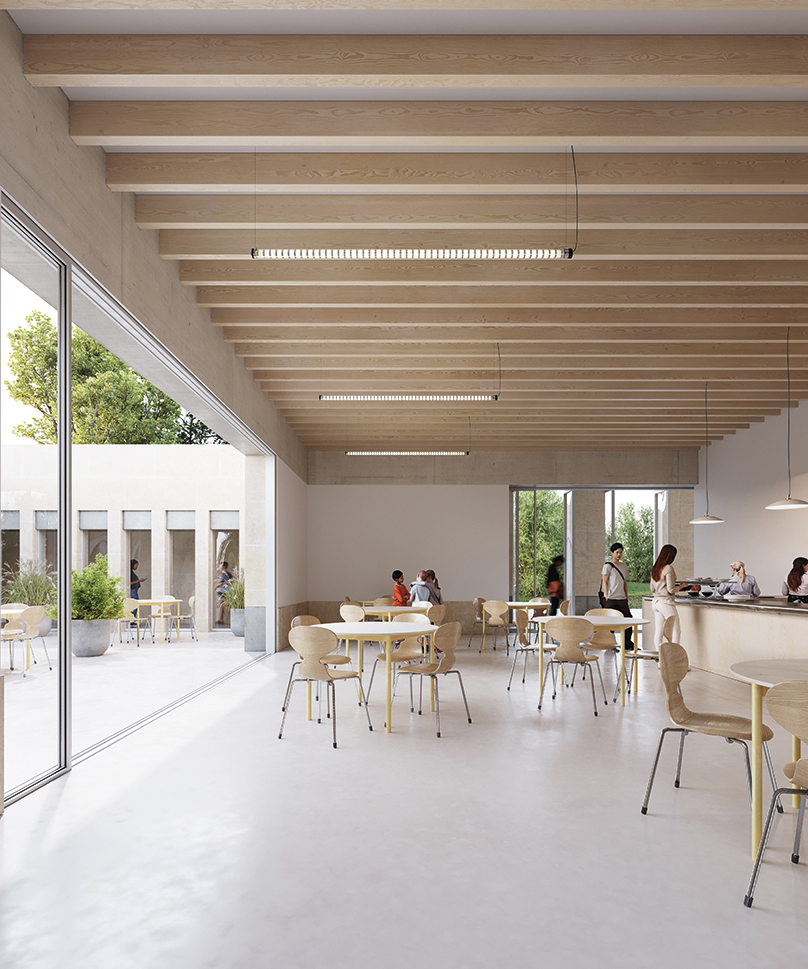 Combas, grand prix national de construction pierre en 2017, a retenu le calcaire blanc crème de Noyant pour les façades porteuses, gage d’ancrage et de solidité dont ont tant besoin les enfants placés. « Source de porosité entre le paysage et l’intériorité des bâtiments », la pierre apparaîtra dans les salles communes alors que le bois prédominera dans les lieux privatifs pour une ambiance chaleureuse. Outre le recours à ces matériaux géo-sourcés, l’excellence environnementale se traduit sur les toitures, les unes végétalisées ce qui améliore l’inertie du bâtiment et le confort thermique, les autres arborant des panneaux photovoltaïques – le projet respecte à cet égard la règlementation RE2020 et le référentiel départemental de qualité environnementale des bâtiments (QEB). Dans un « jeu de dehors dedans, à l’image du quotidien de ces jeunes », chaque maisonnée peut « voir et accéder à un jardin » tandis que la grande baie vitrée du réfectoire donne sur une terrasse. Les extérieurs répondent, eux, à de multiples usages : jardin d’eau, clairière de jeux, avec panier de basket, zone d’en-but et gradins propices aux petits spectacles, terrain boisé dans le fond site, équipé d’une aire de pique-nique et d’un auvent.