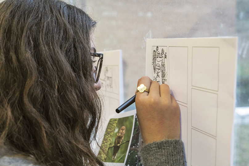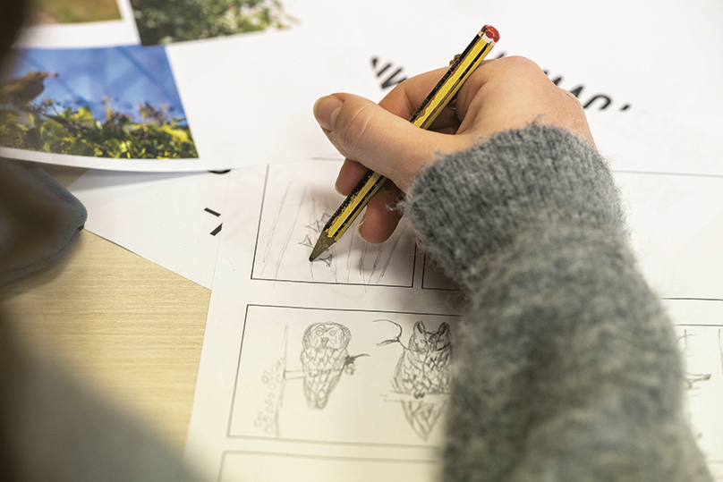 Tels de vrais illustrateurs, les élèves ancrent leurs crayonnés par transparence. Et voilà ce « chat-huant » gravé dans le marbre du papier.© CD92/Olivier Ravoire
