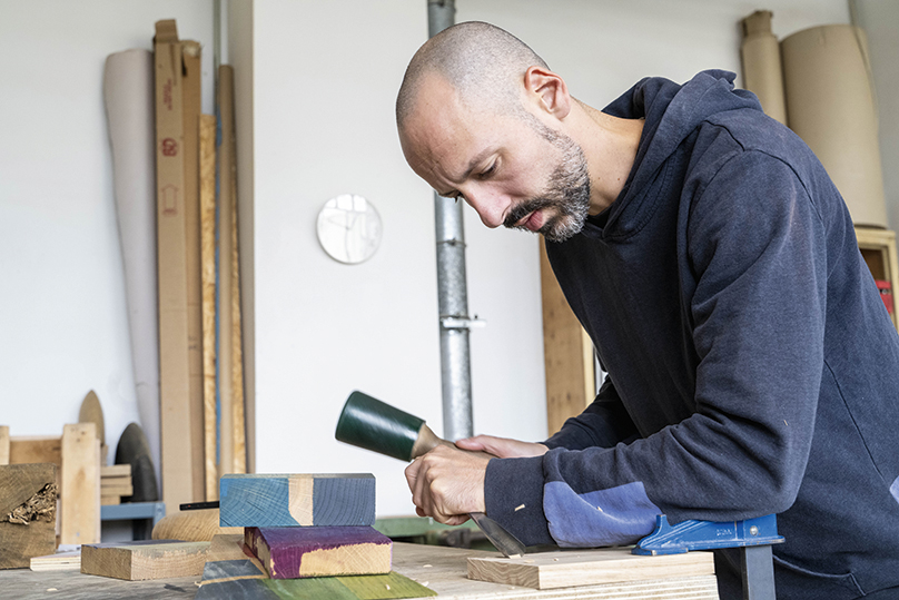 Alors que la coloriste est un « carnaval » à elle seule, le sculpteur extirpe du noir, et rien que du noir, des surfaces sensuelles et rythmées. « Aller vers la couleur remettait en cause à mes yeux la notion de lumière. » Lors de la conception des tabourets, il s’est laissé convaincre d’aller jusqu’au vert pour le pied de l’Obsidienne, mais celui du Cajou est d’un noir profond. « Il est indécrottable », plaisante Marta. En revanche, leur fascination pour le motif répété, lui au ciseau à bois, elle sur papier ou tissu, les réunit ainsi que ce côté tribal, perceptible dans les « motifs en pluie » sillonnant les socles des tabourets. Il crée « sur le vif quitte à rectifier ensuite », une « saisie directe dans la matière » synonyme pour elle de « liberté ». Ainsi, les arêtes vives des soubassements doivent-elles beaucoup au hasard : « Maxime m’a montré cette forme en work in progress, que l’on a gardée. » Autre anecdote, en quête d’une assise, ils se sont essayés à retourner à l’horizontale une sculpture de Maxime ; le bois sous cet angle évoquait « du crin de cheval ou un velours », effet trompe-l’œil parachevé par des lignes qui simulent l’empiècement d’un coussin. « En regardant ces tabourets, on voit qu’on s’est amusés comme des gamins ! », dit Marta.