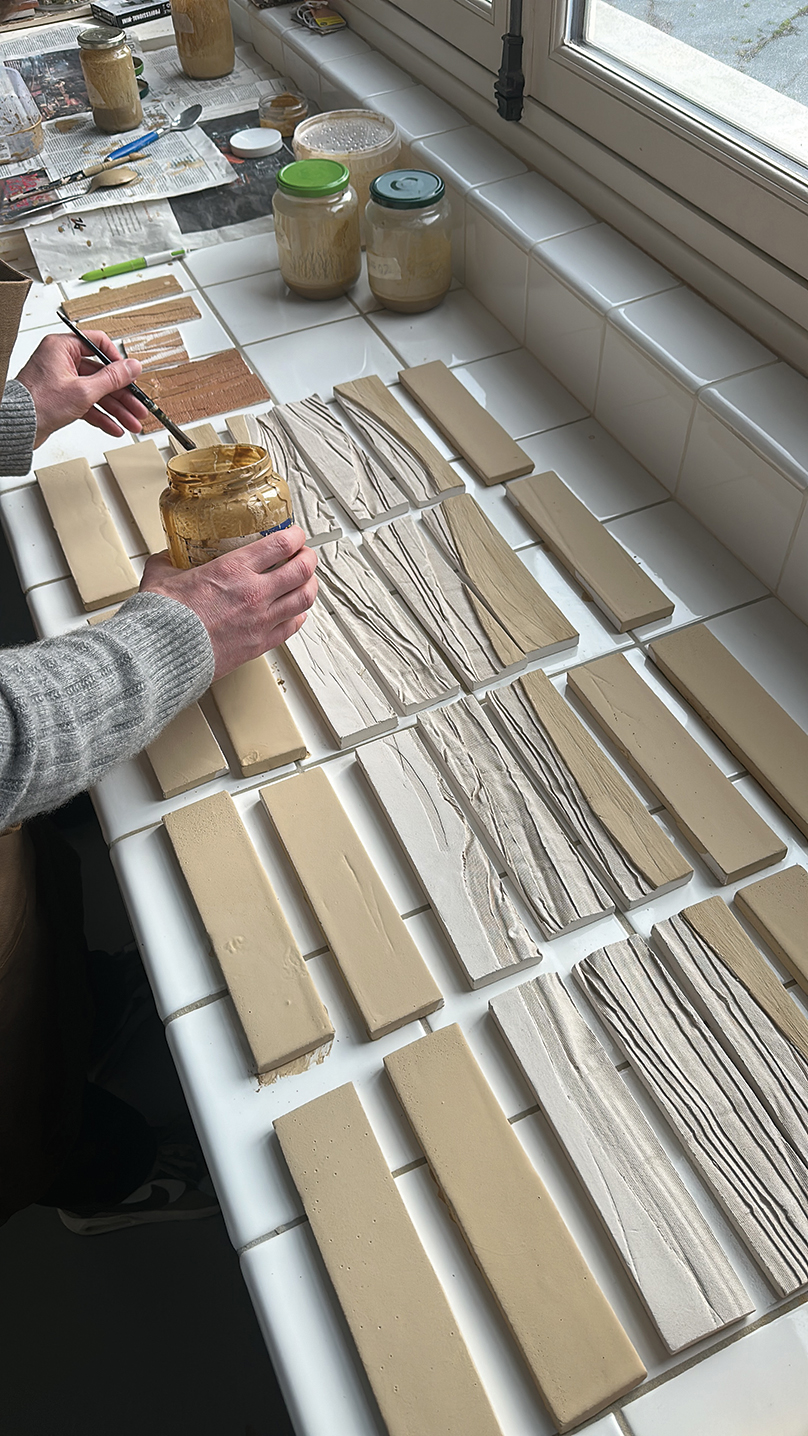 Ces dispositifs aux couleurs chaudes sont prêts à habiller tout bâtiment consentant à la terre – un « changement culturel », concède Vincent. Topographie a été exposé à Milan, Variations à la Paris Design Week, également visible à Sèvres jusqu’en janvier. Le potentiel de la terre créé la surprise auprès des visiteurs. Ils demandent s’il y a du colorant, ils ont du mal à imaginer que les couches sédimentaires présentent des couleurs aussi riches. » Ayant à cœur de transmettre leur passion, ils ont animé récemment un stage au JAD, attirant professionnels et amateurs : « Dans notre métier il y a le plaisir de créer, allié au fait de travailler avec des matières nobles, du vivant, et de transmettre des approches plus respectueuses de l’environnement, explique Lucie. Lors de ces ateliers on constate que ces thématiques parlent aussi à d’autres, ce qui est gratifiant. » À cette occasion, ils ont allié pour la première fois en une même composition enduits de terre crue et peinture pigmentée à base de terres de chantier. Les prémices, qui sait, d’un prochain projet ?