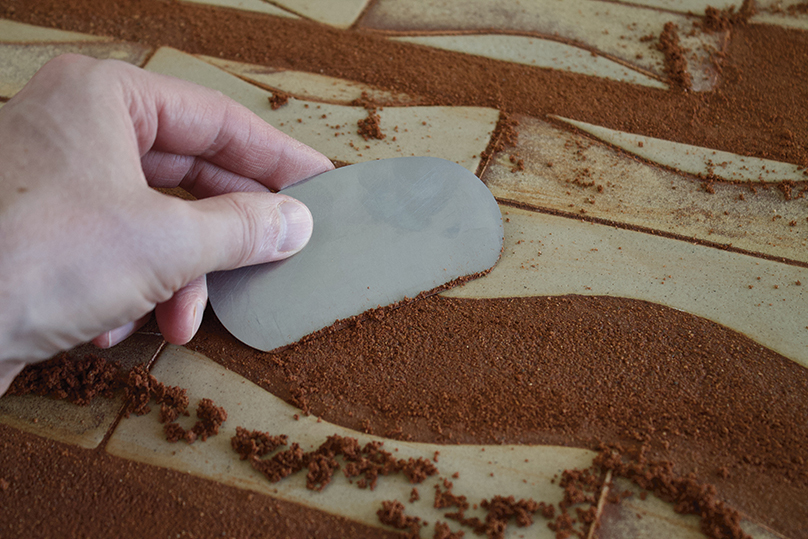 Ce lien avec le territoire culmine dans le travail des designers Lucie Ponard et Vincent Le Bourdon à partir de terres de chantier du centre aquatique départemental de la Grenouillère, à Antony. « Prélevés au sac et à la pelle », s’il vous plaît. Entre eux, tout relevait de l’évidence : la terre les fascine tant pour son potentiel plastique que pour sa capacité à créer des langages et environnements sains et durables. La terre crue pour le fondateur du studio Elementos, dont le spectre d’intervention va des enduits au mobilier et aux objets. La terre cuite pour la designer et céramiste, capable, à partir de rebuts de chantier, de sublimer les couleurs et les textures d’un paysage. « Ces projets à deux sont un moteur, dit Vincent, l’un lance une idée, l’autre se l’approprie, la prolonge et la complète… » Le premier projet, Topographie, les conduit à plaquer un textile rigide sur la terre crue, créant une surface plissée puis émaillée au moyen d’une poudre de terre locale, de manière à obtenir des tableaux évocateurs des plis et des strates géologiques. Le projet suivant, Variations, décliné en trois nuances différentes, unit leurs techniques en un seul et même motif répété sur un panneau en bois : un carreau rectangulaire tronqué, laissant apparaître un demi-œil, dessin inspiré d’un projet parallèle de Vincent avec la designer olfactive Carole Calvez, exemple s’il en est de « fertilisation croisée ».