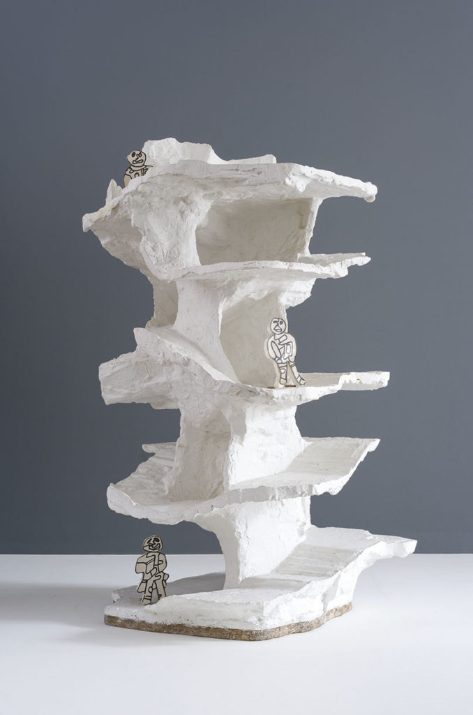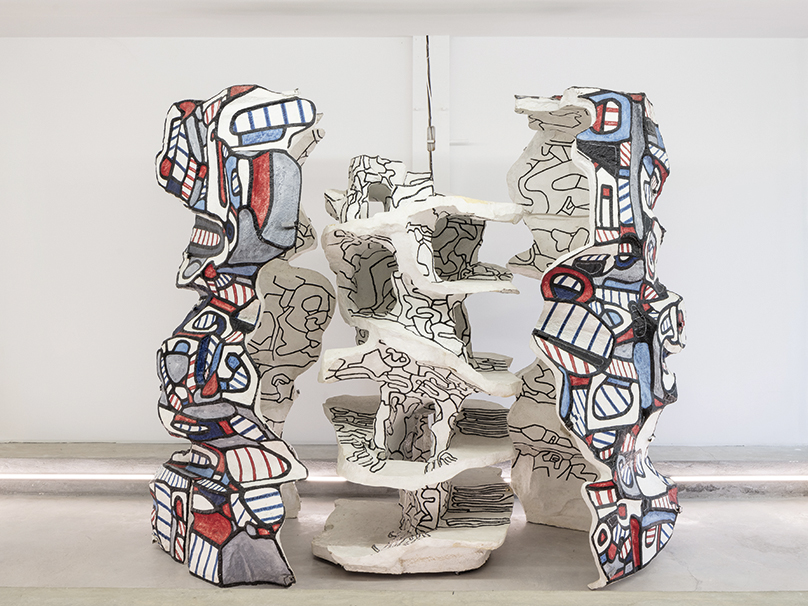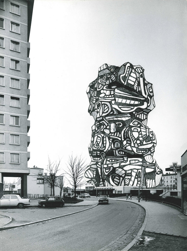 Quitte à renverser les choses, commençons par la fin de cette aventure monumentale que retrace l’exposition d’Issy-les-Moulineaux et remontons le temps. En 2015, la Tour aux figures, propriété de l’État classée Monument historique depuis 2008, est acquise par le Département des Hauts-de-Seine qui prend en charge la double restauration de la Tour et de son Gastrovolve intérieur, lequel rouvre en 2020. La commande publique, envisagée en 1983, avait pris corps en 1985 avec le choix du site définitif sur l’île Saint-Germain, validé par Jean Dubuffet. Pour lui qui se disait effrayé par les difficultés de la réalisation concrète, la Tour aux figures demeurerait éternellement debout dans son imaginaire : il meurt en mai 1985 et Richard Dhoedt – le collaborateur historique qui sera chargé trente ans plus tard de la restauration – en assure la construction sous la supervision de la Fondation Dubuffet. Achevée en 1988, la Tour aux figures avait d’abord surgi, en juillet 1967, d’un bloc de polystyrène expansé, taillé et peint. Une drôle de graine féconde que l’artiste s’échinera à faire germer une année durant, enracinée dans l’idée d’une sculpture monumentale puis se développant, à grand renfort de maquettes et de plans, comme une architecture de 24 mètres de hauteur. Les deux commissaires de l’exposition – Charlotte Guinois, conservatrice en chef du patrimoine au musée français de la Carte à jouer et Déborah Lehot-Couette, directrice scientifique et des collections de la Fondation Dubuffet – évoquent un « architecte d’un genre particulier imaginant […] des édifices sans portes, sans fenêtres, sans meubles. Ses habitations fantasques ne répondent en rien aux normes architecturales. » Pour celui qui entendait « restituer à l’architecture son caractère d’art, oublié depuis si longtemps, […] avec ce que la notion comporte de caprice et d’invention », l’étincelle première avait jailli à l’été 1962 « au bout du fil », comme on disait en ce temps où les téléphones intégraient effectivement un fil ; certains le torsadent entre les doigts, Dubuffet, lui, gribouille au stylo bille des formes abstraites blanches, rouges, bleues, plus ou moins hachurées et cernées de noir. Un nouvel univers créatif s’impose à lui, qui va l’occuper au moins dix ans : L’Hourloupe. « Le mot, déposé et breveté, est une invention du peintre, expliquent les commissaires. Il est né d’un jeu d’association de consonance de mots empruntés aux contes et aux nouvelles populaires : hurler, hululer, loup, Riquet à la houppe de Perrault et Le Horla de Maupassant. » Des historiens d’art y devinaient aussi le mot « entourloupe »… Cela n’aurait peut-être pas déplu à un créateur friand de grotesque et de poésie farce, qui en 1968 décrivait ainsi son projet d’édifice : « Précisons que cette tour n’est pas conçue en vue de fournir un logement dans la forme en usage actuellement dans nos lieux, congé y étant donné aux encombrantes commodités des cuisines, bains, etc. N’y sont par ailleurs prévus nuls meubles ; ni autres sièges, lits ou tables, que ceux, inamovibles, offerts par quelques opportunes protubérances de la configuration accidentée du sol. On y gagne que la maison tout entière peut être à tout moment lavée, sans rien à déplacer pour cela, avec une lance à incendie. Mais on se trouve en revanche obligé au vivre sans bagage. L’usager de cette demeure devrait donc, s’il n’est célibataire et s’il n’est résolu à la vie érémitique, l’utiliser seulement comme un lieu occasionnel de retirement et de rêverie. »